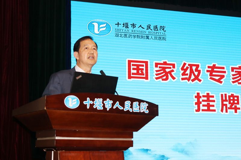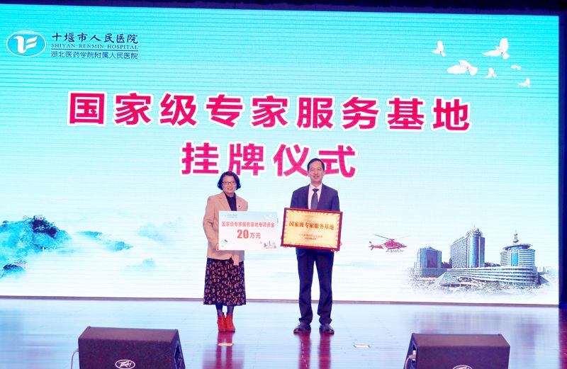 市人社局党组成员、副局长周继红代表人力资源社会保障部向十堰市人民医院党委书记、院长钟森转授“国家级专家服务基地”牌匾,并转发20万基地服务经费。