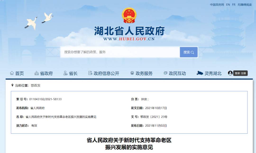 近日,湖北省人民政府官网发布重磅文件——《省人民政府关于新时代支持革命老区振兴发展的实施意见》,事关湖北多地未来发展!下面来看看有哪些内容。