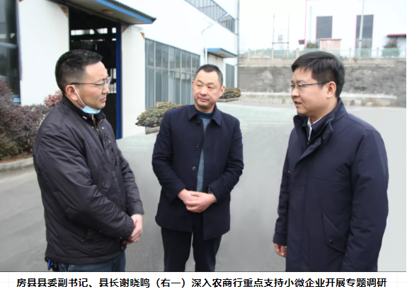1月25日下午,房县县委副书记、县长谢晓鸣,县委常委、常务副县长高勇,县委常委、副县长黄克伟等在房县农商行党委书记、董事长辛明宏的陪同下深入农商行重点支持小微企业开展专题调研。
