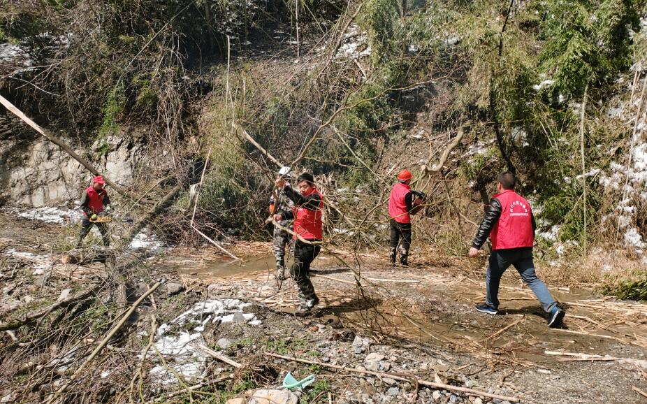 在二荒村,倒伏的树木拦住了通村公路,几名身着红马甲的志愿者正使用油锯将倒伏在道路中间的树木砍下拖到旁边堆放好。