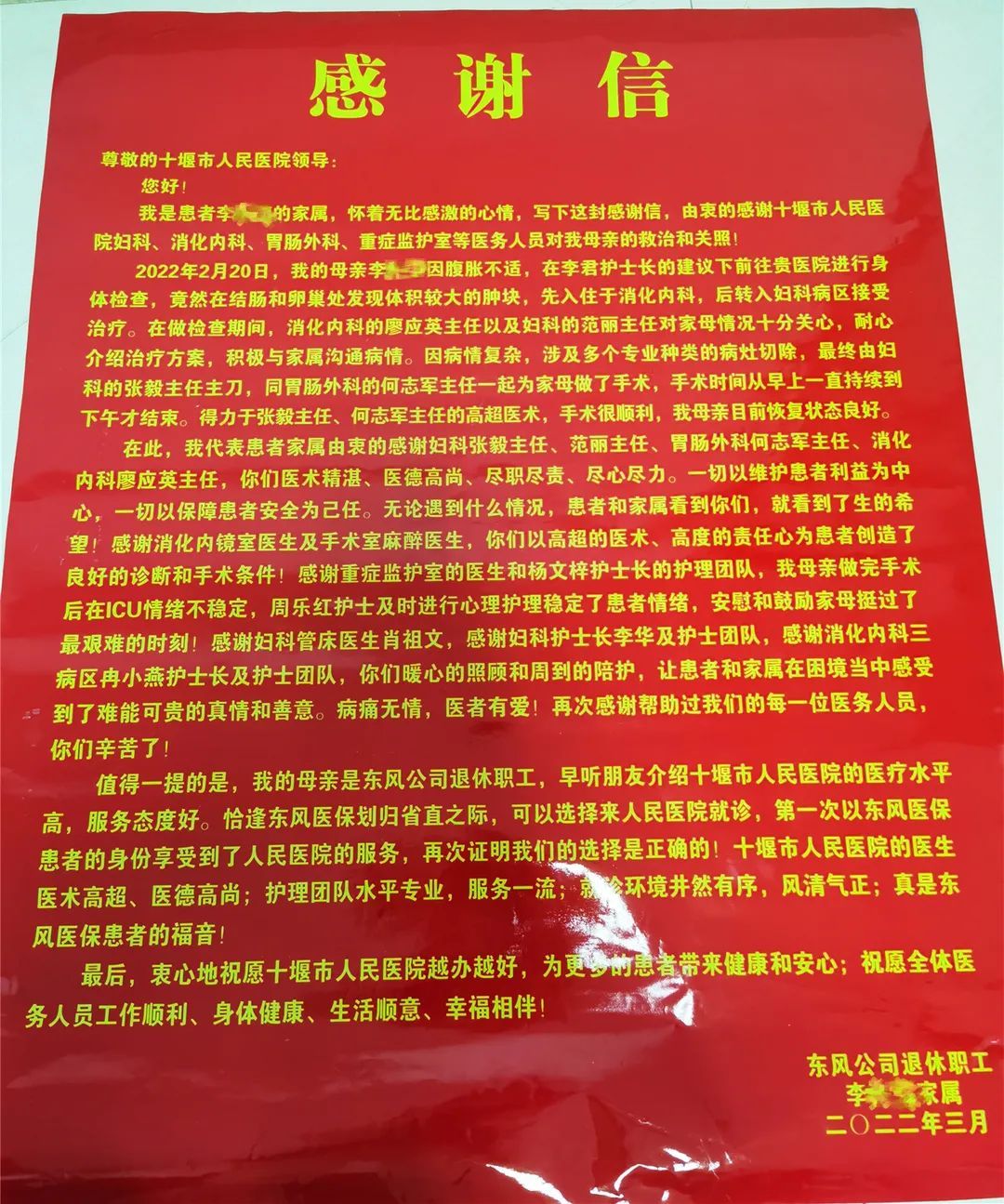 3月8日,记者从市人民医院妇科了解到,术后患者恢复好,无感染、吻合口漏等并发症,不日可出院。为表达谢意,患者家属专门给妇科、消化内科、胃肠外科、重症医学科等医护人员写来感谢信,“十堰市人民医院的医疗水平高、服务态度好,第一次以东风医保患者身份来这里就医,事实证明这个选择是正确的”。