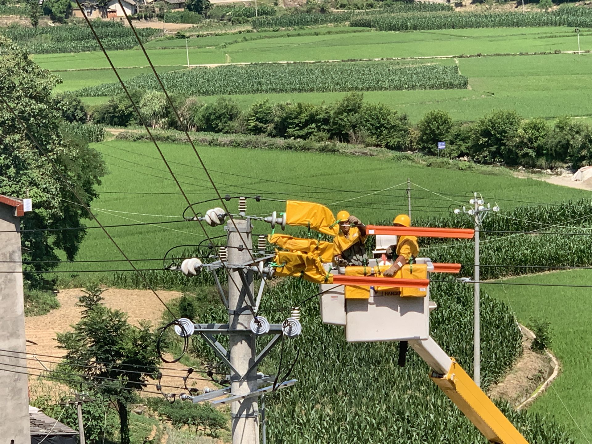 带电搭火作业现场,工作人员全副武装,戴上绝缘手套,穿上厚重绝缘服,乘坐绝缘斗臂车到达高空作业点。工作人员对带电路进行绝缘处理后,剪断引流线实施导线搭接。烈日当空,高温下的斗臂箱内,温度高达50摄氏度。工作人员强忍炎热、密切配合,经过一个小时紧张施工,完成搭火作业任务。
