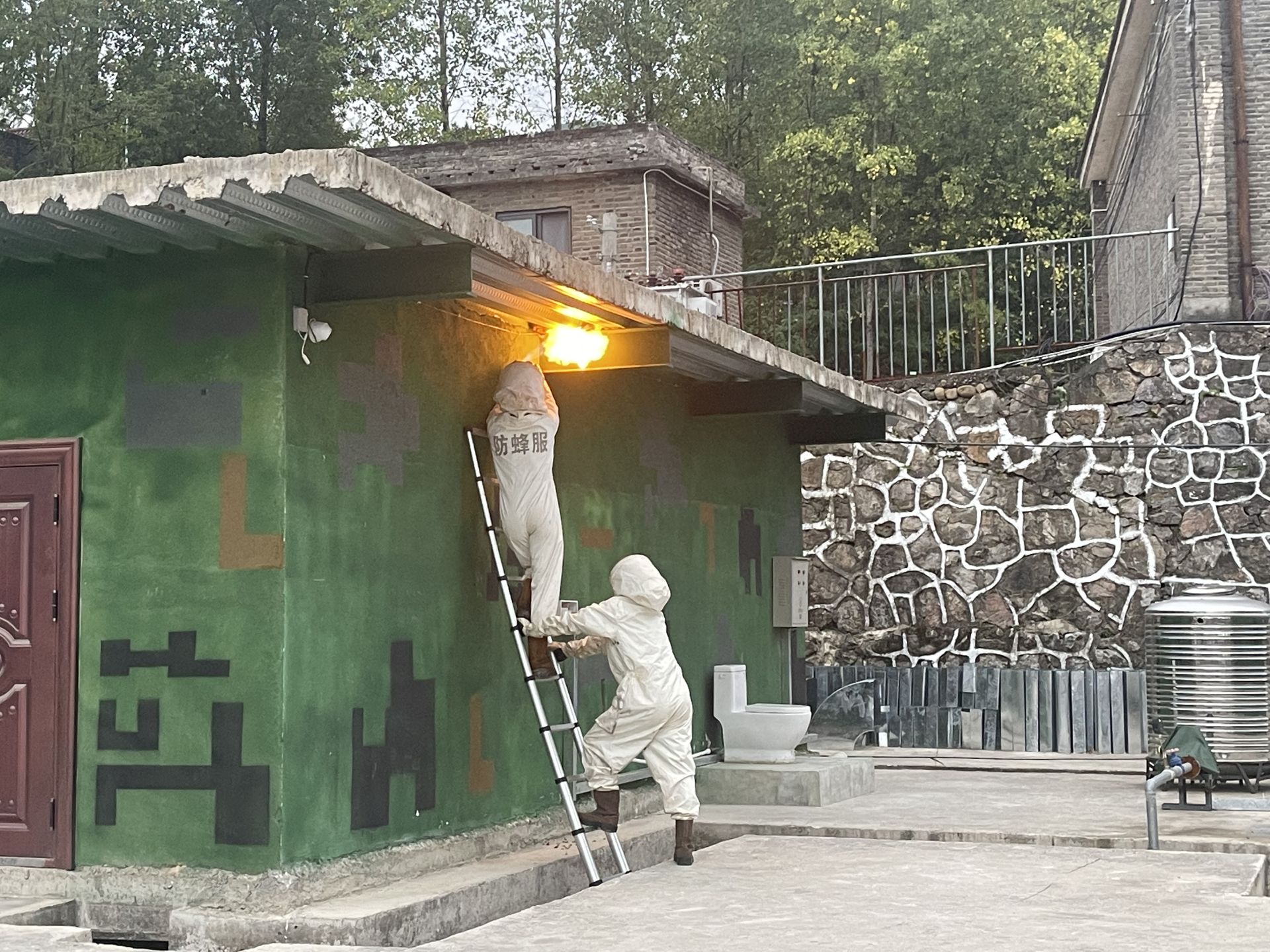 接到报警后,消防队迅速组织专业人员出动前往处置。到达现场后,发现居民区周边大大小小有6个马蜂窝,有的马蜂窝“违建”在路边树上,有的“违建”在房梁上,有的“违建”在建筑物上,最大直径足有10厘米。为了加强自身安全防护,消防人员穿好防蜂服做好保护措施后,针对不同地方的马蜂窝,分别采取“火烧法”、“套袋法”、“水冲法”等战术,将一个个马蜂窝顺利摘除。最后又拿出杀虫剂进行喷洒,防止马蜂再次“安家”,消除了安全隐患,解决了群众的后顾之忧。
