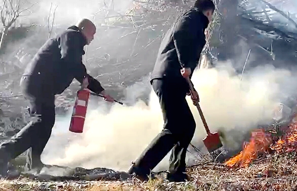到达现场后,民警发现着火现场均为树木干草,并且阵风不断,现场火情在阵风作用下迅速蔓延,情况十分危机,为防止火势继续蔓延,民警兵分两组,拿出携带十瓶干粉灭火器进行灭火,从两个方向使用干粉灭火器和灭火工具进行扑火,经过数十分钟的紧张扑救,最终及时扑灭此次山林火灾。