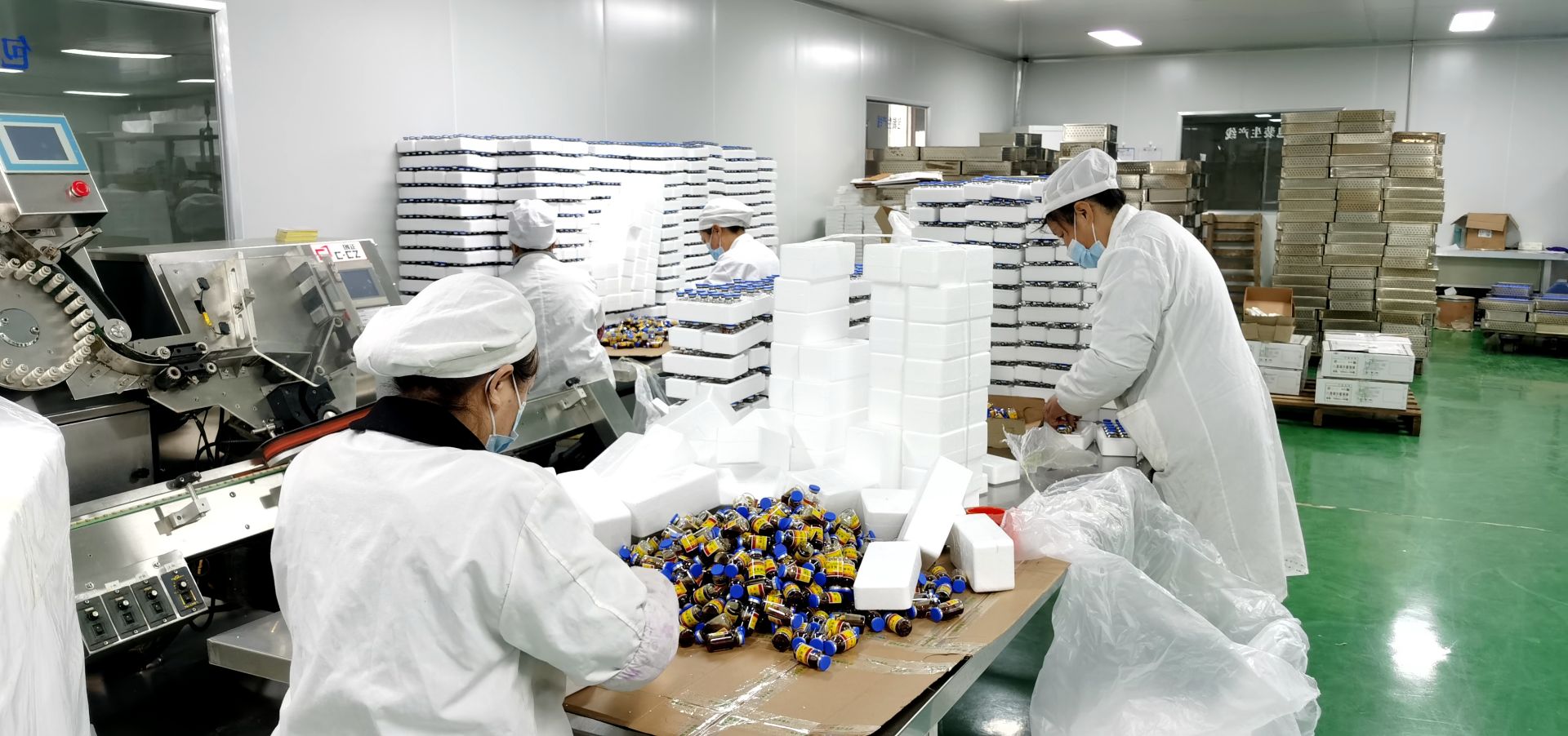 在粉针包装车间内,工人们在各个环节上忙碌作业,全力以赴抓生产、赶进度。
