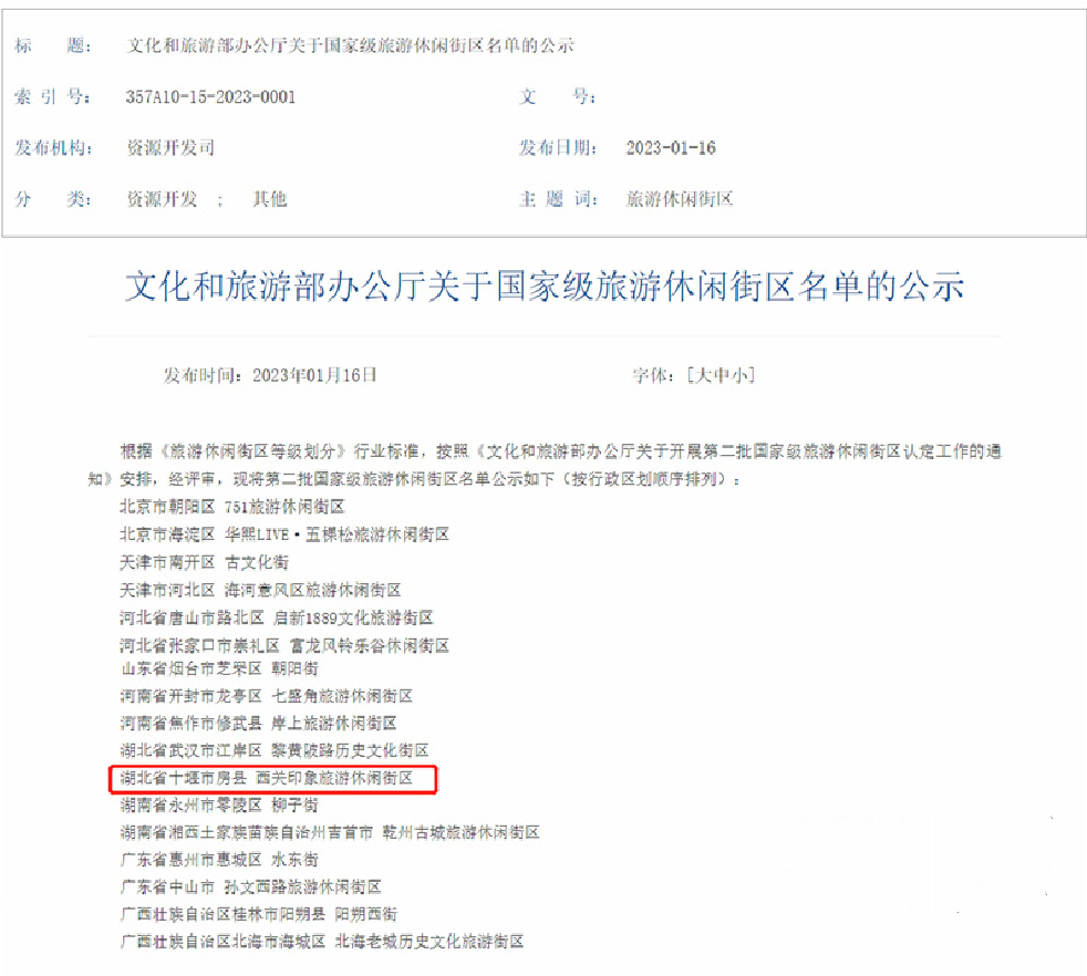 日前,文化和旅游部办公厅发布了第二批国家级旅游休闲街区名单,房县西关印象街区成功入选。这是西关印象继2022年荣获湖北省旅游名街、湖北省华侨国际文化交流基地、湖北省旅游休闲街区、湖北省最美公共文化空间、湖北省特色商业街后又一国家级荣誉。