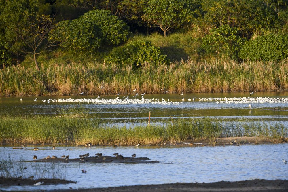 ↑鹭鸟在海南儋州市新英盐场湿地人工栽种的红树林间觅食(2022年11月8日摄)。