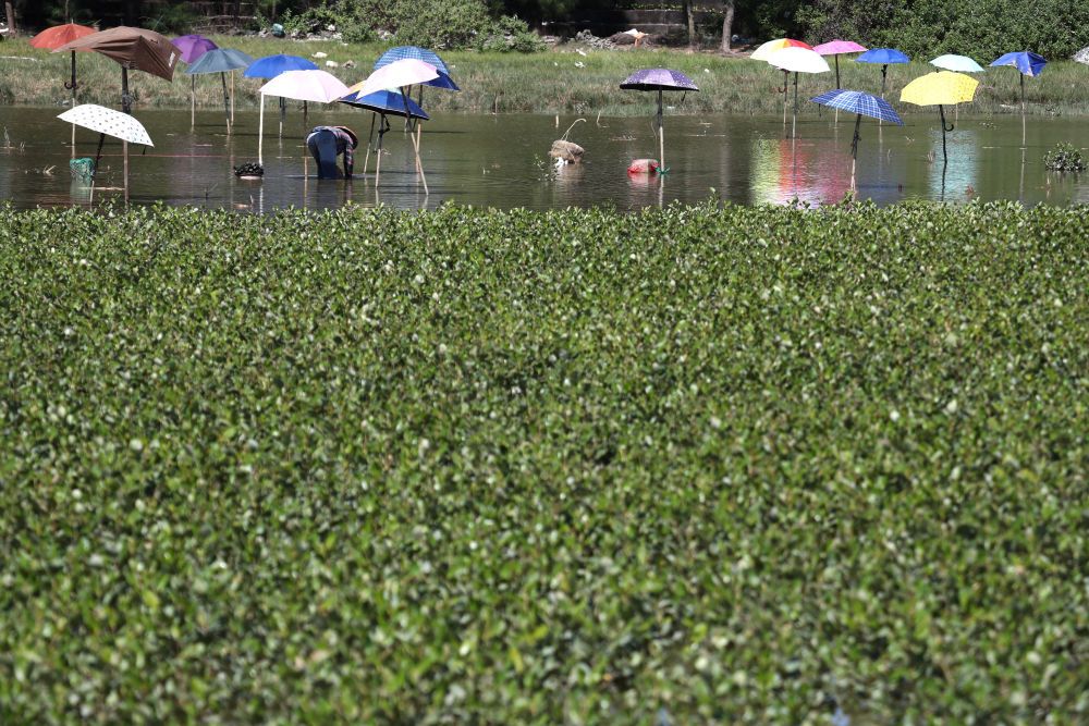 ↑村民在广西钦州市钦南区犀牛脚镇海边的红树林苗圃里育苗(2021年10月3日摄)。
