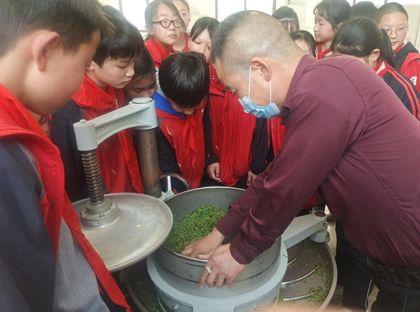 沐浴着春光,走进窑淮镇窑场村神农贡茶园,放眼望去满山翠绿,阵阵茶香沁人心脾。活动中,孩子们观茶树、闻茶香,欣赏着绿意盎然、生机勃勃的茶园风光。老师向学生讲解茶厂的历史、茶园的管理、种茶的技艺和制作茶叶的过程和步骤。茶园技术人员指导挑选鲜叶和采摘手法,学生们学以致用,边学边练,热情高涨,穿梭在茶树间体验采茶收获的乐趣。两个小时的实地体验之后,学生们争向老师展示劳动成果,一篮篮嫩绿的茶芽,映衬着他们挂着汗珠的笑脸。