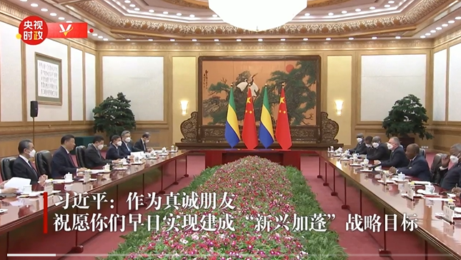 习近平指出,你是中国人民的老朋友,很高兴再次同你会面。总统先生是我再次当选国家主席后接待的首位非洲国家元首,这充分体现了中加关系的重要性和高水平。近年来,在总统先生领导下,加蓬积极探索适合本国国情的发展道路,致力于促进国家稳定和经济多元化,国家建设取得重要成就。作为加蓬的真诚朋友,我们衷心祝愿加蓬各项事业取得更大进步,早日实现建成“新兴加蓬”战略目标。