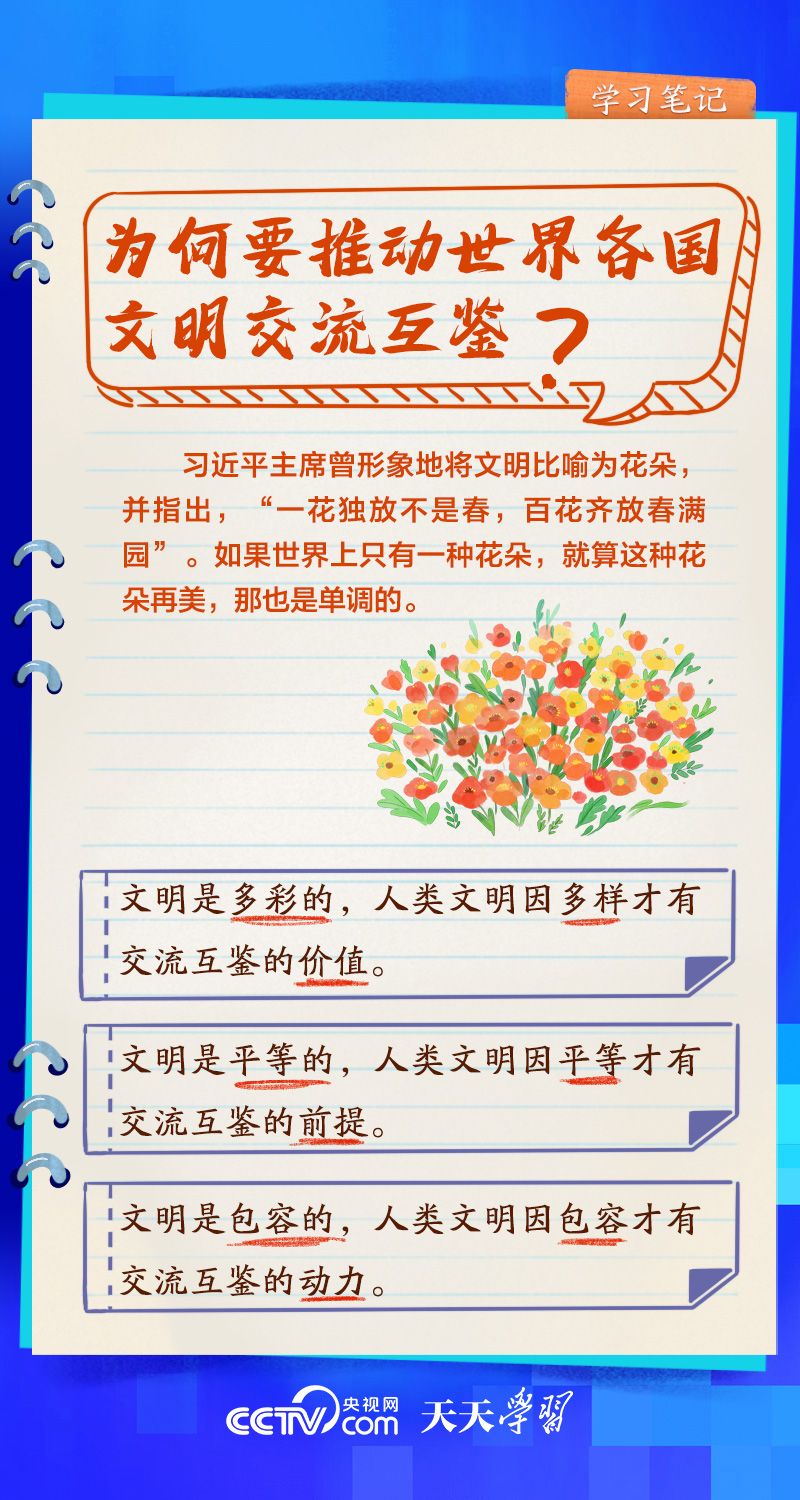 文明交流互鉴,是推动人类文明进步和世界和平发展的重要动力。从在联合国教科文组织总部等国际场合深刻阐释新时代中国的文明观,到亲自倡议举办亚洲文明对话大会,再到首次提出全球文明倡议……习近平主席在不同场合向世界阐述文明交流互鉴的意义,不断夯实构建人类命运共同体的人文基础。《天天学习·学习笔记》梳理总书记相关重要论述,与您一同学习。