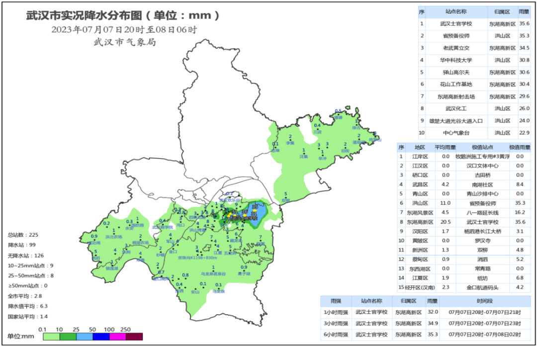 最大累计雨量为东湖高新区武汉士官学校站35.6毫米最大小时雨强为东湖高新区武汉士官学校站32.0毫米最大阵风为长江二桥站16.5m/s(7级)