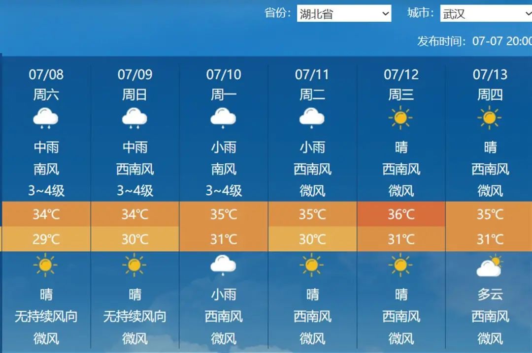 下周一武汉多云,中心城区最高气温36℃,远城区35℃,直至下周四武汉都在35-36℃。