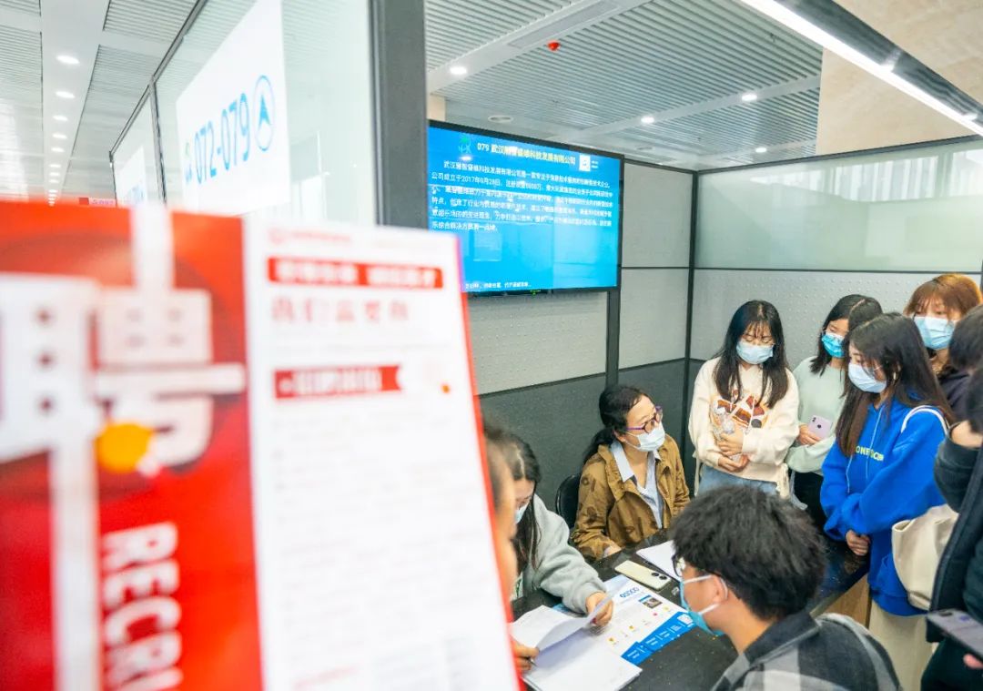 2023年3月9日,光谷国际人才港,东湖高新区 2023 年春季大学生巡回招聘会专场吸引许多准备留汉工作的大学生前来求职。 (湖北日报全媒记者 魏铼 摄)
