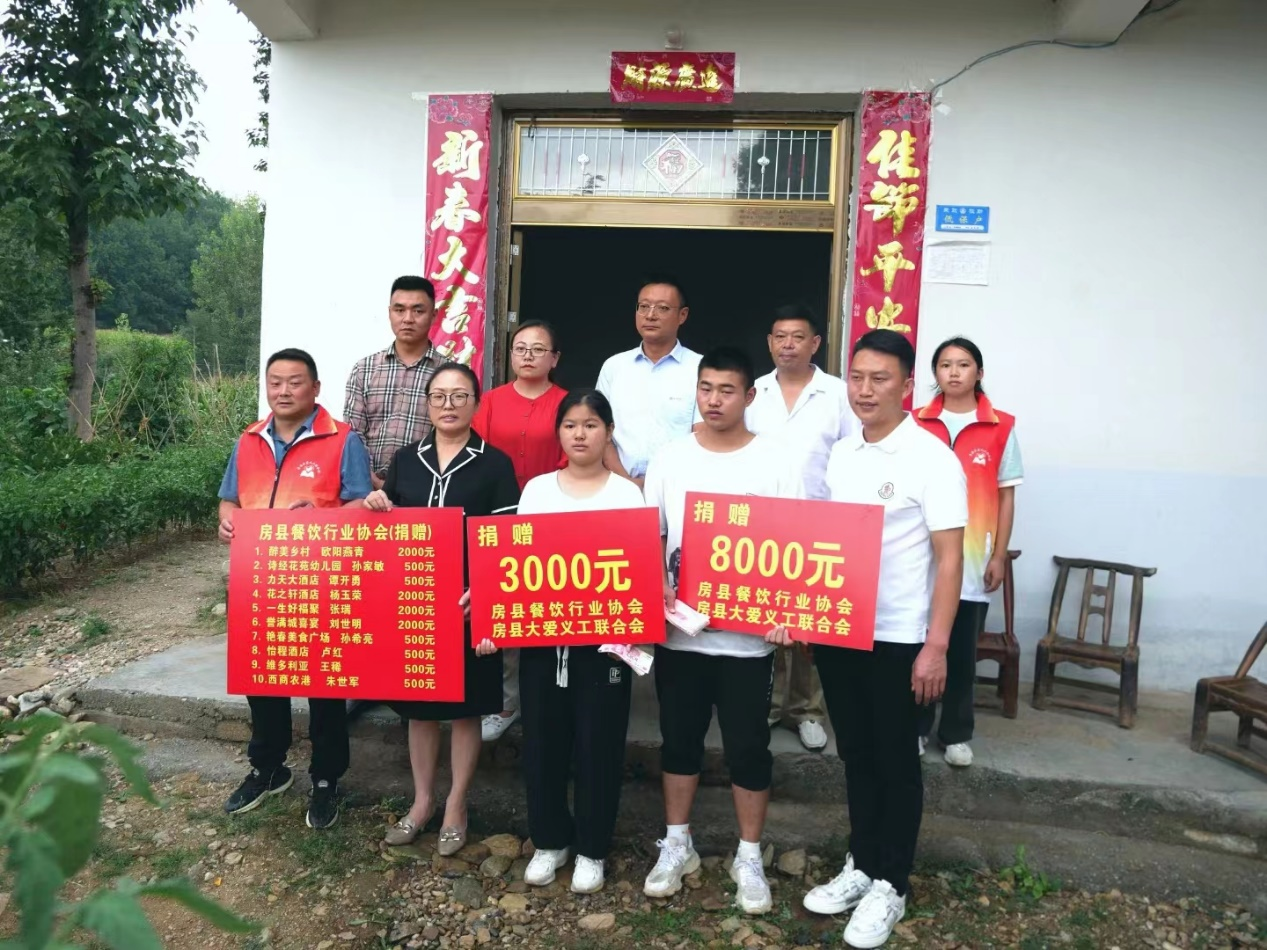 房县“新时代好少年”任慧雯自小与哥哥任俊超相依为命,靠国家救助生活。今年任俊超考上了大学,面对学费和生活费一筹莫展,在即将放弃继续求学机会时,房县餐饮协会10名会员慷慨解囊、踊跃捐资11000元,于8月25日将捐款送到兄妹俩家中,鼓励他们自强自立、奋力拼搏、完成学业、建设家乡,并表示会持续关心关注他们的学习生活情况,遇到任何困难都可以随时跟他们取得联系。