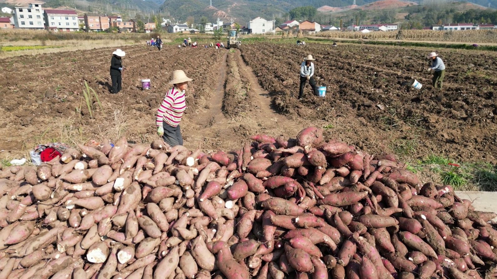 随着红薯收获机在地里来回穿梭,一垄垄体态饱满,颜色鲜亮的红薯破土而出,村民们忙着给新出土的红薯去泥、分拣、装袋……一堆堆红薯伫立在田地里,构成了一幅丰收的画卷。