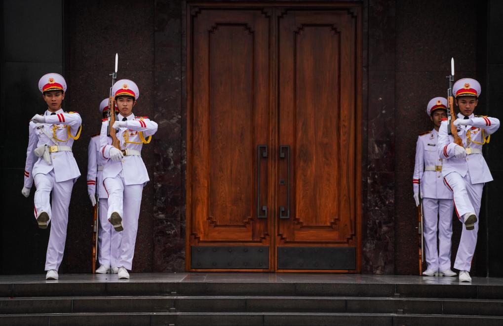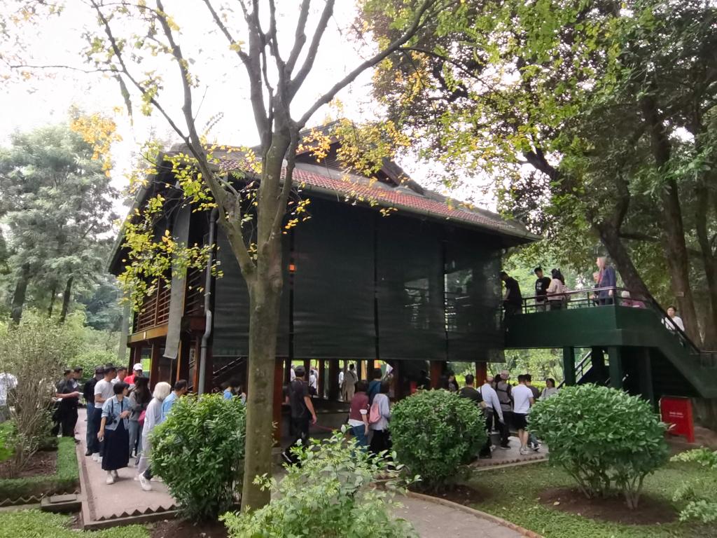 在河内地标巴亭广场一侧,坐落着胡志明陵和胡志明故居。记者抵达广场时,守卫胡志明陵的仪仗兵正在举行换岗仪式,众多民众和游客高举相机或手机,记录下这庄严肃穆的一刻。胡志明陵北侧的胡志明故居内,各国游客排起长队,在他曾长期居住和工作的高脚屋下驻足留影。