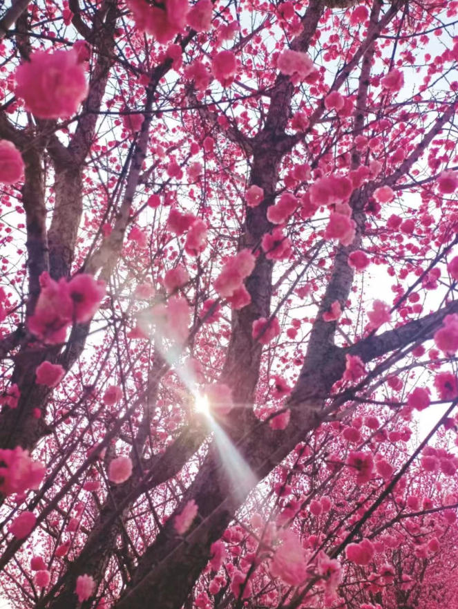 红梅映着山野春光,微风拂过,花影婆娑。走近轻嗅,清香丝丝,让人心生欢喜。