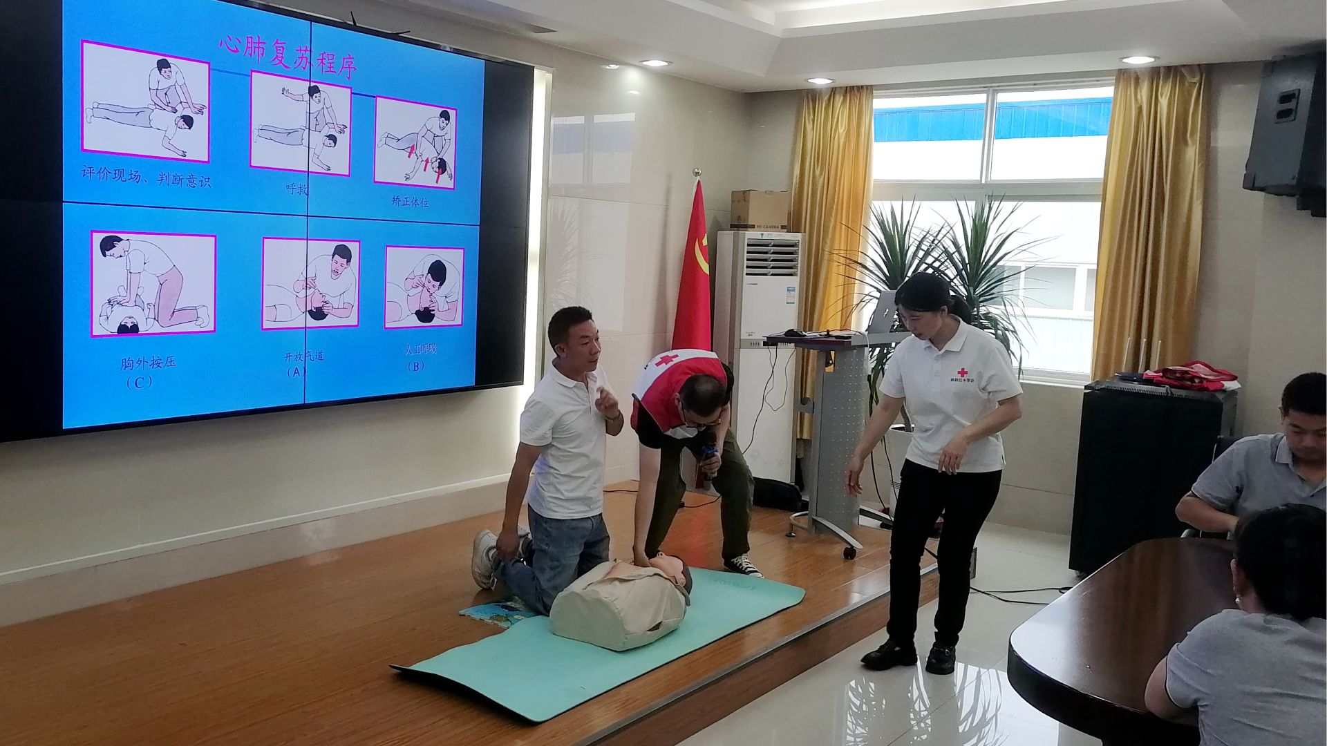 培训现场,来自县红十字会的救护专家通过理论讲解、现场演示和实践操作相结合的方式,向企业职工们详细讲解了《中国红十字会救护培训大纲》,以及救护新概念,提倡见义智为,救人不舍己的自救互救思维、创伤急救技术、现场心肺复苏、中毒、触电、溺水、烧伤等意外事故现场急救知识。