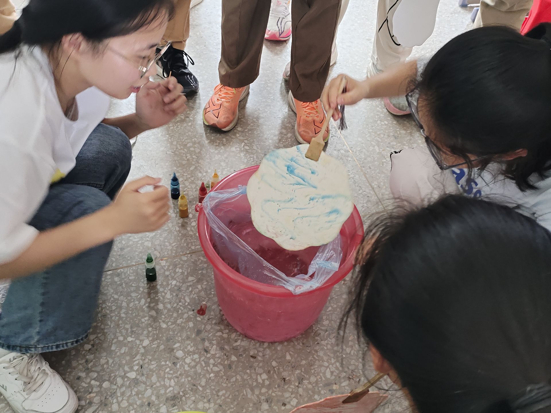 近两周的日子里,支教团队精心准备了多样化的课程。他们引入了AI绘画课程,让孩子们通过简单的操作创作出独一无二的艺术作品;开展了主题为“人生拍卖会”的心理课,帮助同学们树立正确的价值观;将漆扇艺术带入课堂,讲解了漆扇绘制的基本技法、漆扇历史、制作流程与色彩搭配,带领同学们进行漆扇制作;解读了《清明上河图》《千里江山图》等作品,让同学们真切感受到了中国古代绘画之美和历史的魅力;准备了丰富生动的植物手工实践类特色课程,指导同学们利用植物叶片制作拓染帆布包、苔藓生态瓶和植物相框,激发了孩子们的创造力和动手能力;通过《英语趣配音》课程提升学生的口语水平,用《疯狂动物城》《爱丽丝梦游仙境》等激发同学们的学习兴趣,让他们感受不同文化的碰撞与融合。此外还开设了篮球、乒乓球、排球、声乐、器乐、舞蹈等课程,让同学们在体育锻炼中释放压力,在艺术熏陶下提升审美能力。