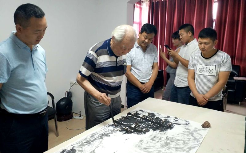 毕老作画博采众长,工山水,擅画树木,尤爱松柏,其作品注重气势,笔 墨浓重华滋,写心寄情,新意迭出。虽81岁高龄,但精气神儿十足。