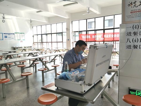 此次检查以检测食堂食材为重点,检查人员利用便携式食品快速分析系统对食堂的食用油、蔬菜、肉类进行随机抽样检查。还对该校食堂相关组织制度是否建立并执行、食堂实际经营项目是否在许可范围内、餐厨废弃物是否做生活垃圾处理并记载、从业人员健康管理等情况进行了详细的查看。