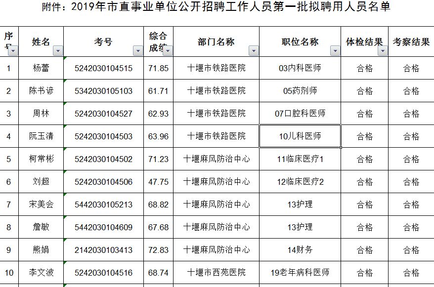 根据《2019年十堰市直事业单位公开招聘工作人员公告》和公开招聘有关文件规定,经笔试、资格复审、面试、体检、考核和选岗,现将第一批拟聘用人员名单予以公示: