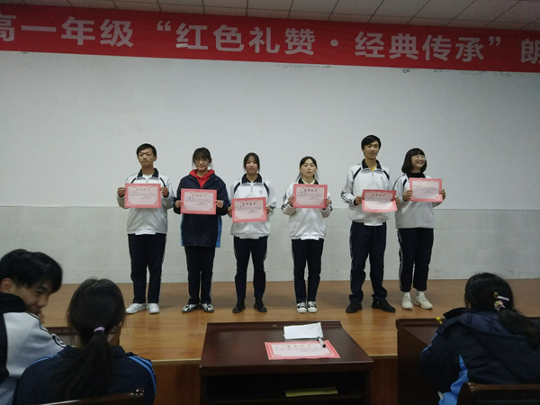最后,全体学生手持五星红旗,高声歌唱“没有共产党就没有新中国”,把朗诵活动推向高潮!经过一个多小时激烈角逐,高一7班朗诵的《我骄傲,我是中国人》荣获一等奖;高一2班朗诵的《少年中国说》、高一8班朗诵的《相信未来》荣获二等奖;高一3班朗诵的《我心中的祖国》、高一5班朗诵的《我的祖国》、高一10班朗诵的《我的南方和北方》荣获三等奖。