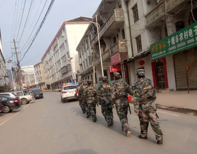 房县新闻网讯 通讯员 何阳 报道:2月14日,青峰镇党委政府组织发动城建工作人员、退役军人、民兵、民警,组建专门队伍,负责在集镇内大街小巷进行来回巡逻,宣传疫情相关知识,劝返劝诫群众,全力防控新冠肺炎疫情。
