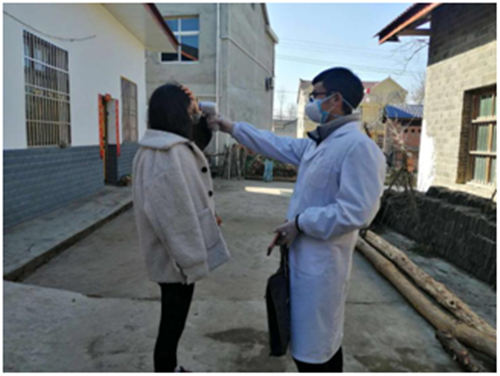 在村上,青年村医们穿着白大褂、戴着口罩,挨家挨户的往村民头上“来一枪”,他们每天都要为返乡人员测量体温。在别人都躲在家里的时候,他们自己却暴露在外,用专业践行使命。