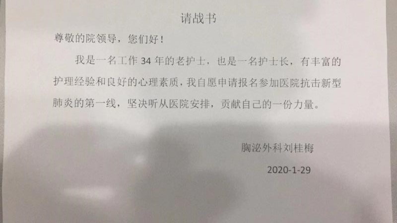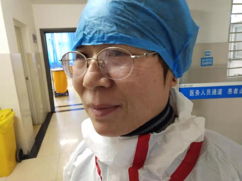 今年52岁的刘桂梅,担任县医院感染科护士长和胸泌外科护士长多年,19岁参加工作,疫情侵犯时,是医院第一个递交请战书的人。有着33年护龄的资深护士长刘桂梅同志说:“我们是医护人员,防控面前我们守在一线,是我们医护人员义不容辞的责任。”