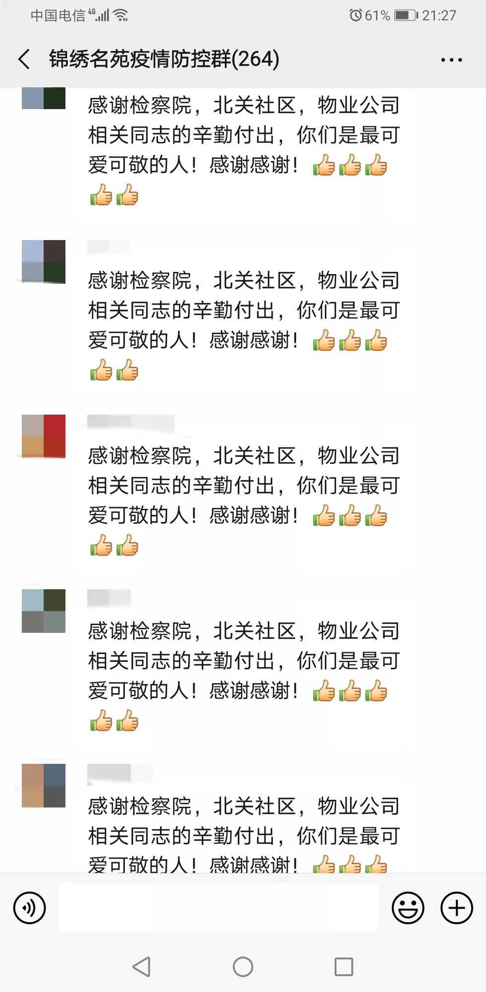 物资配送完毕,锦绣名苑疫情防控群里业主的感谢消息如雪片般纷至沓来:你们是最可爱可敬的人!