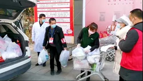 ”2月19日上午,城关镇老城社区网格员张文和他的同事们手提青菜、面条、卫生纸等生活物资,按照“订单”上的地址送到社区居民家门口,让群众安心“宅”在家中。