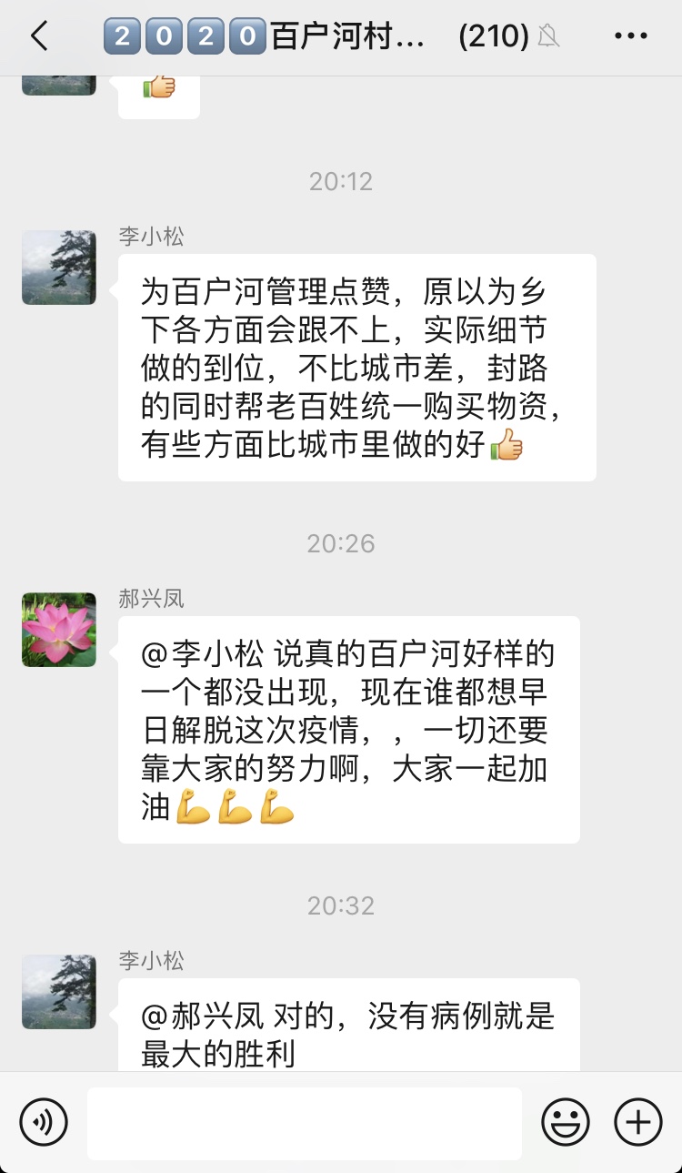 为更好地服务村民,百户河村委会建立了5个便民服务微信群,不仅可以普及疫情防控知识信息,还可以方便大家交流,及时回应群众诉求。2月13日晚上8点12分,百户河村民李小松在微信群里说道:“为百户河管理点赞,原以为乡下各方面会跟不上,实际细节做的到位,封路的同时帮老百姓统一购买物资,细节做得也好!”“说真的百户河好样的,一个(确诊或疑似病例)都没出现,现在谁都想早日解脱这次疫情,一切还要靠大家的努力啊,大家一起加油!”村民郝兴凤回应道。