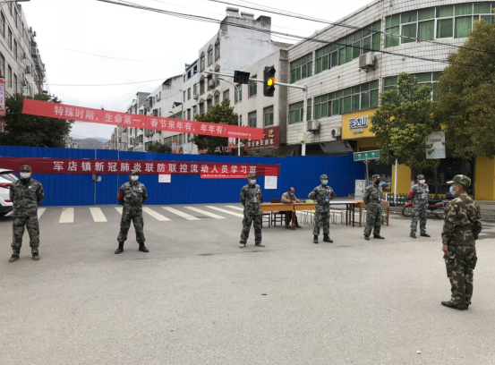 目前,军店镇13个村居共设置道路卡点125个,40多名基干民兵参与执勤管控,他们牢牢守卫着军店的大门,构筑起抗击疫情的严密防线。