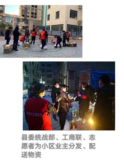 四是代购物资保基本,当好“保障员”。每天通过每栋楼的业主群收集业主生活物资、药品等需求,做细代购物资登记、下单、催送、分发等工作,在县委统战部、工商联的统筹和协调下,诗经花苑小区采取集中分类、配送上门的方法,将代购的物资统一放置在小区地下车库,根据每家每户的订单需求分类装好,再由志愿者们通过电梯将代购的物资准确送至居民家中,确保小区居民不出户、不下楼,有效避免了人员流动和聚集。