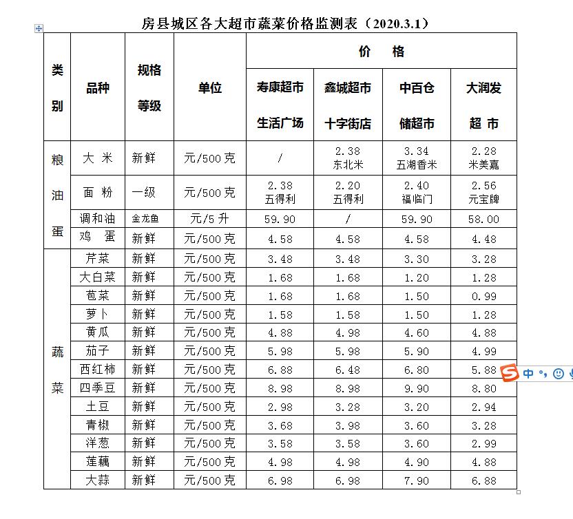 根据县发展和改革局、县市场监督管理局新冠肺炎疫情期间保供稳价联席会议精神,县发展和改革局安排专人深入各大超市对部分居民生活必需品价格进行了监测,现将价格公示如下。后期,我们将连续对各大超市蔬菜价格进行比较公示,对价格连续处于高位的超市将由市场监管局深入调查、立案查处。