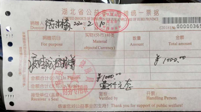 房县新闻网讯 通讯员 解锐 邓兆锋 报道:国家兴亡,匹夫有责。3月4日长滩河村村委会收到一封特殊的书信!信上写到 “在国家遭受严重“疫”情的危难时刻,国人理应顾全大局,同舟共济,解囊相助,共克时艰,现捐献人民币壹仟圆,以微博之意,感谢党的教育之恩。”这是陈恒炳捐款信封里的留言。
