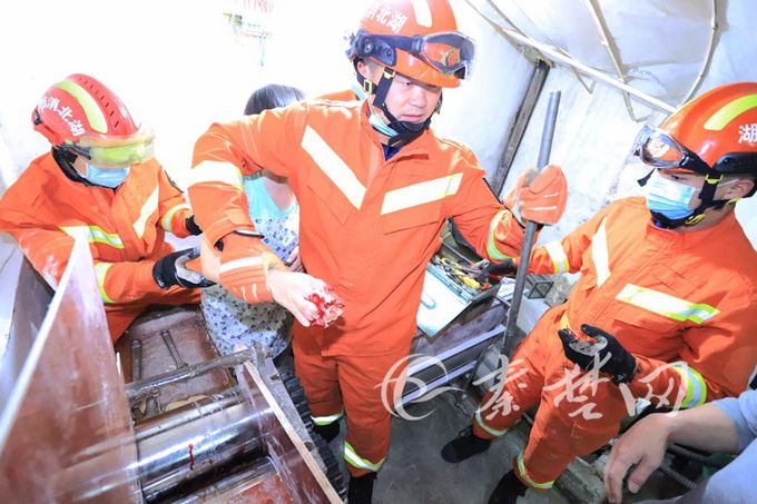 房县新闻网讯 特约记者 徐源祥 报道:11日7时52分,城关镇丁字街一鲜面馆内发生一起意外事故,一女子在操作压面机的过程中,手指不慎搅进机器内,被死死“咬”住。危急时刻,十堰消防赶往现场展开救援,仅用两分钟时间,就拆卸机器,救出被困者。