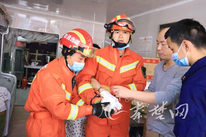 到达现场后发现,消防救援人员发现女子手已经被机器挤压变形,如果利用破拆工具进行破拆,很有可能对手部造成二次伤害,并且救援时间会增加。了解情况后,消防救援人员一边安抚女子情绪一边利用活动扳手对固定轴承的两侧螺丝进行拆卸,大约2分钟,成功将女子被卡的手取出。女子手部血流不止,情况不容乐观,由于120到达现场还需一段时间,指挥员当即决定驾驶消防车将女子送往医院救治。行进路上消防救援人员不断对伤者情绪进行安慰,并利用喊话喇叭对过往车辆进行快速疏导让路,不到5分钟分钟将伤者送到了县人民医院急诊室。