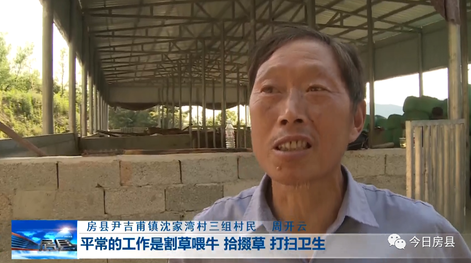 房县尹吉甫镇沈家湾村三组贫困户周开云说:“平常的工作是割草喂牛、拾掇草,打扫卫生,工资去年牛少一点一个月1500元。