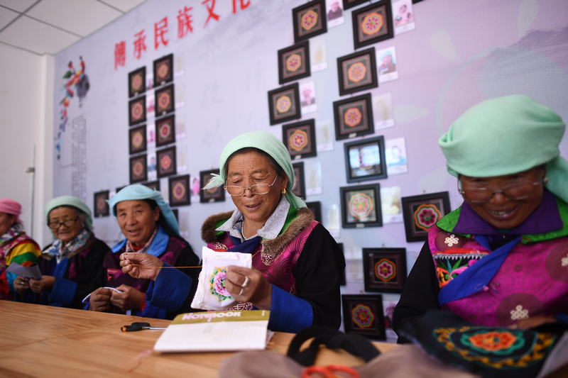 村里还用国家精准扶贫专项资金修建了一座盘绣园。“村里的妇女在这里平均每人每年能有6000元的收入,最多的一年能挣1.7万元。”现任驻村第一书记袁光平说。