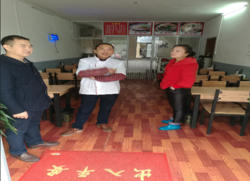 驻村帮扶干部肖永红(左)与宦金忠夫妻俩在温泉大道边早快餐店沟通情况