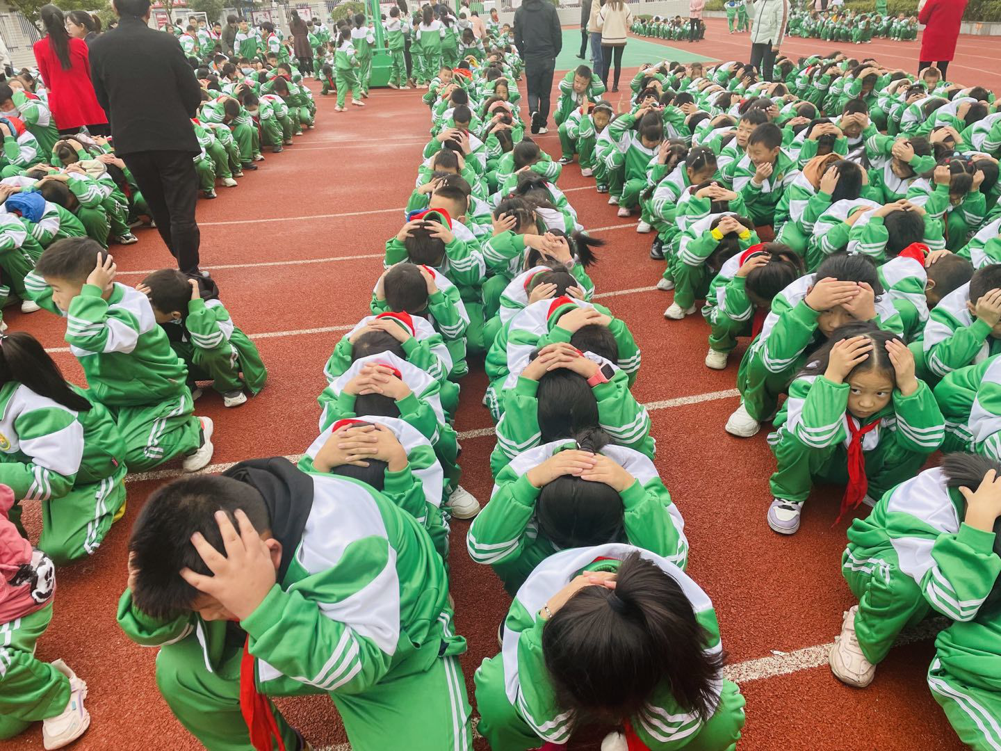 当“地震警报”信号第二次响起时,紧急疏散演练正式拉开序幕,全体同学在各楼层老师的指挥带领下,按照提前制定的演练方案,安全有序地从前、后门撤离教室,到达指定的场地上。各班同学排成了两路纵队抱头屈膝蹲在疏散地点,各班班主任组织学生开始清点人数,并报告给“指挥部”。整个实战演习活动紧张有序,有条不紊。