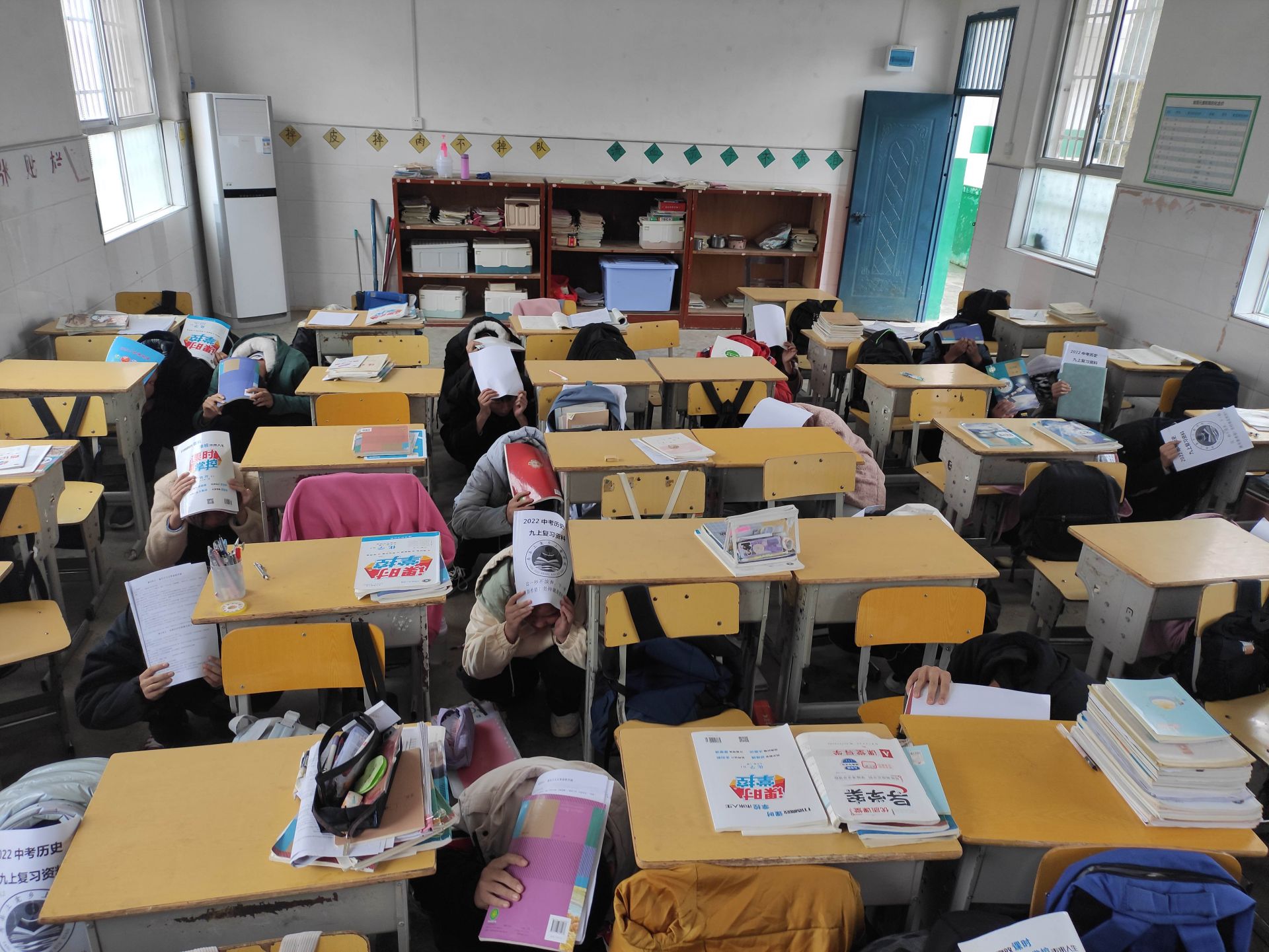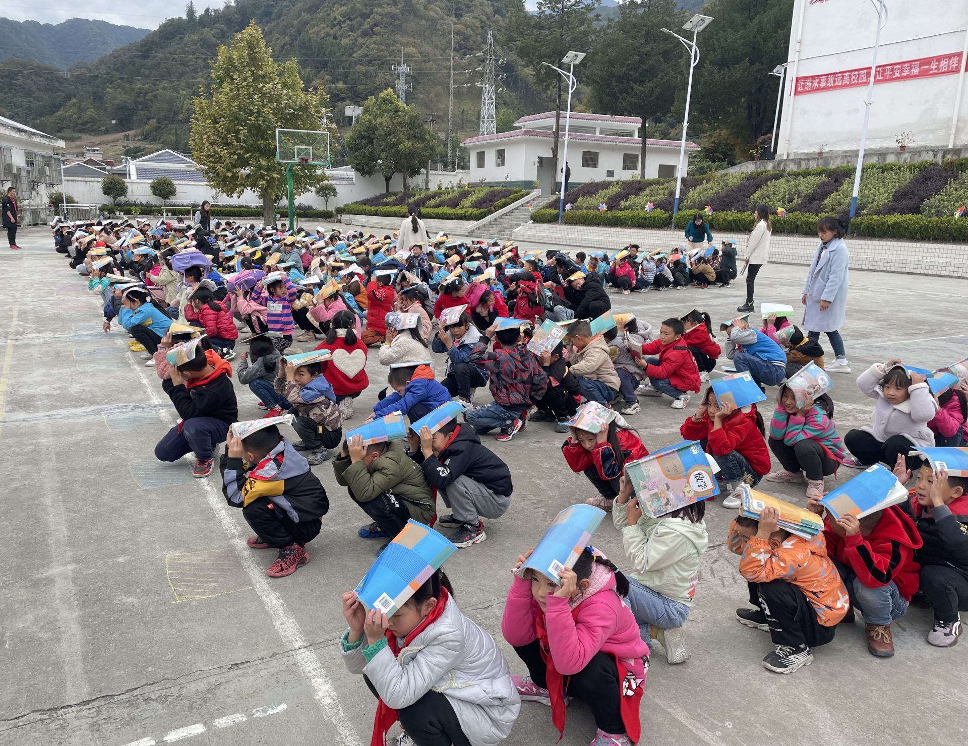 下午3时,上龛学校校园内演练警报声响起,各班老师根据学校的安排,在听到警报短音响起后,正在上课的教师立即停止了授课,转为教室演练负责人,快速指导学生迅速做好避震准备,孩子们就近躲避,迅速蹲到坚固的课桌旁,用双手护住头部。
