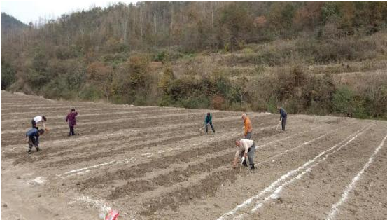 在土城镇穿山堰村一百余亩收获后的田野上,几台大型农业机械正在忙碌着,田野里漂浮着泥土的清香。另一边几十名劳力正忙着,撒石灰、修沟、起垄、搭架,一排繁忙的景象。