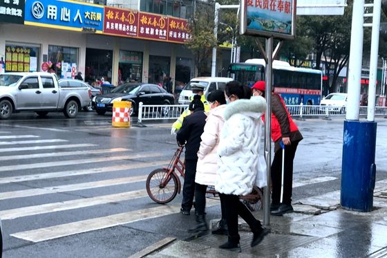 “大爷你好,请稍等一下,你看现在人行道指示信号灯是红的,等它变绿了才可以通行。”