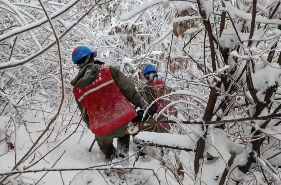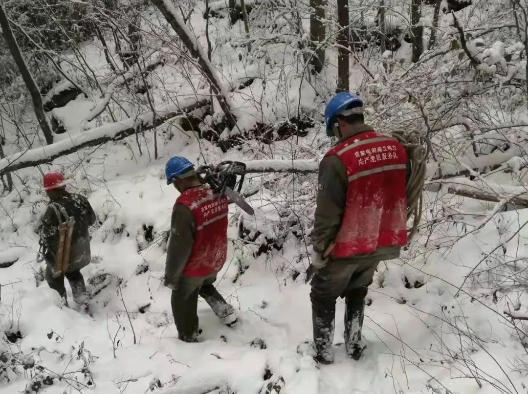 1月27日,万峪河乡骤降大雪,导致班河片区供电线路故障,电线杆断裂。电力工人组成党员突击队,第一时间对供电线路进行维护,保障电力畅通。
