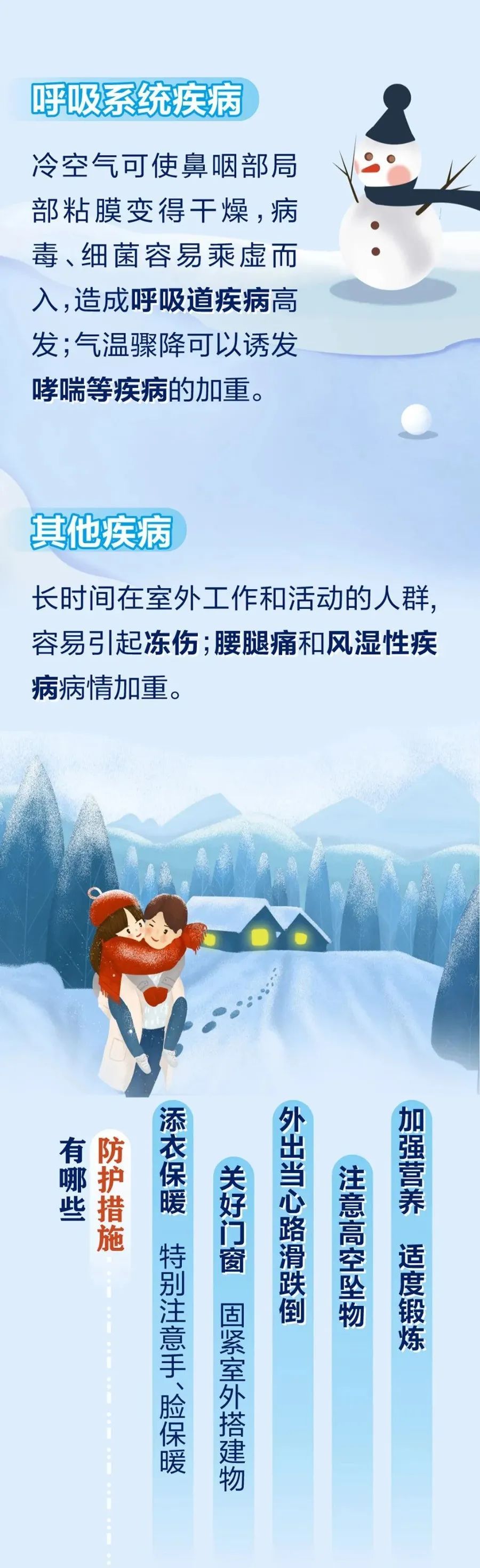 提请做好低温雨雪冰冻天气的防范应对,注意防寒保暖,正值春运高峰期,加强道路积雪结冰对交通运输的不利影响防范,做好设施农业及林木幼苗的防冻,加强城镇供电、供水、供暖供气管网等安全排查和冰冻防护。