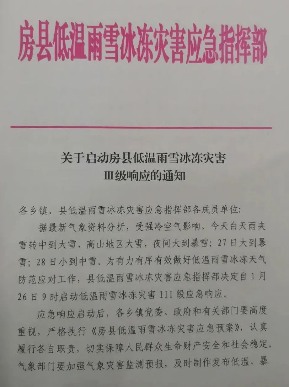 房县紧急启动低温雨雪冰冻灾害三级响应